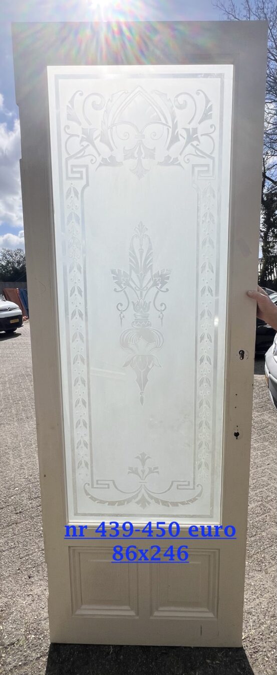 Aantal van deze maat. 1x met gezand straalt glas helemaal heel. Ik heb nog zo’n deur in dezelfde maat nr 427a- 4 foto’s ook mooi als tochtdeur. Kan ook als kamer en suite deuren. prijs per stuk